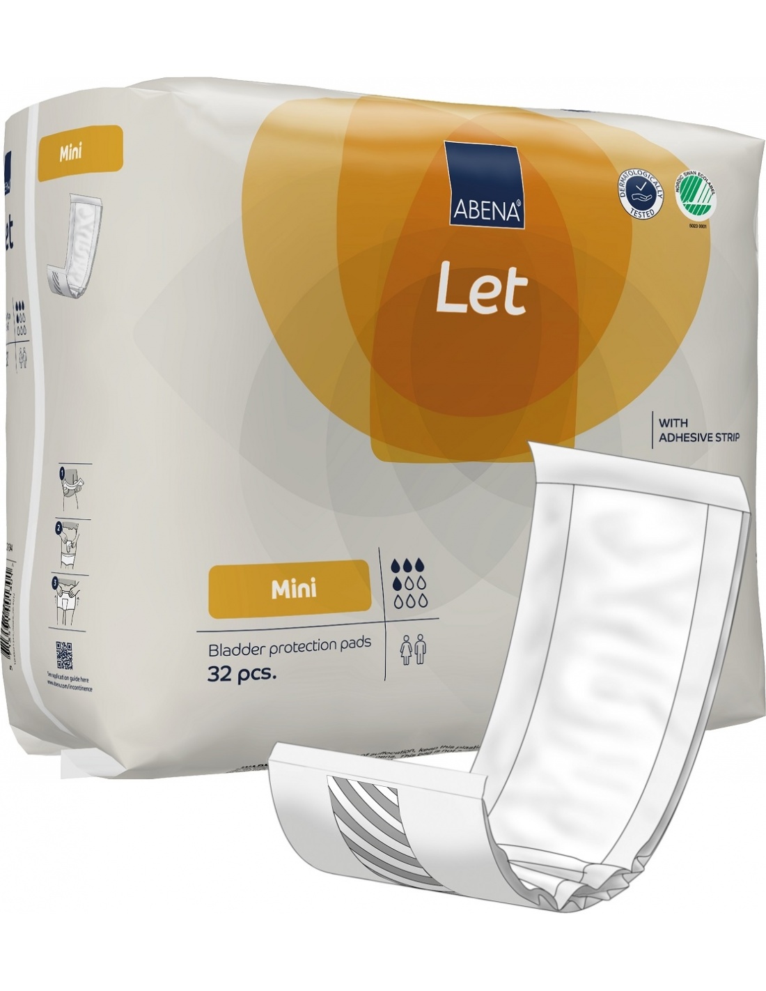 - Abena Let Mini este un tampon absorbant dreptunghiular cu miez moale si ultrasubtire. Aceste produse au folie alba de tip textil (TBS) si benzi albe autoadezive pe spatele suportului. Poate fi folosit ca un tampon de maternitate sau un tampon pentru incontinenta foarte usoara.
