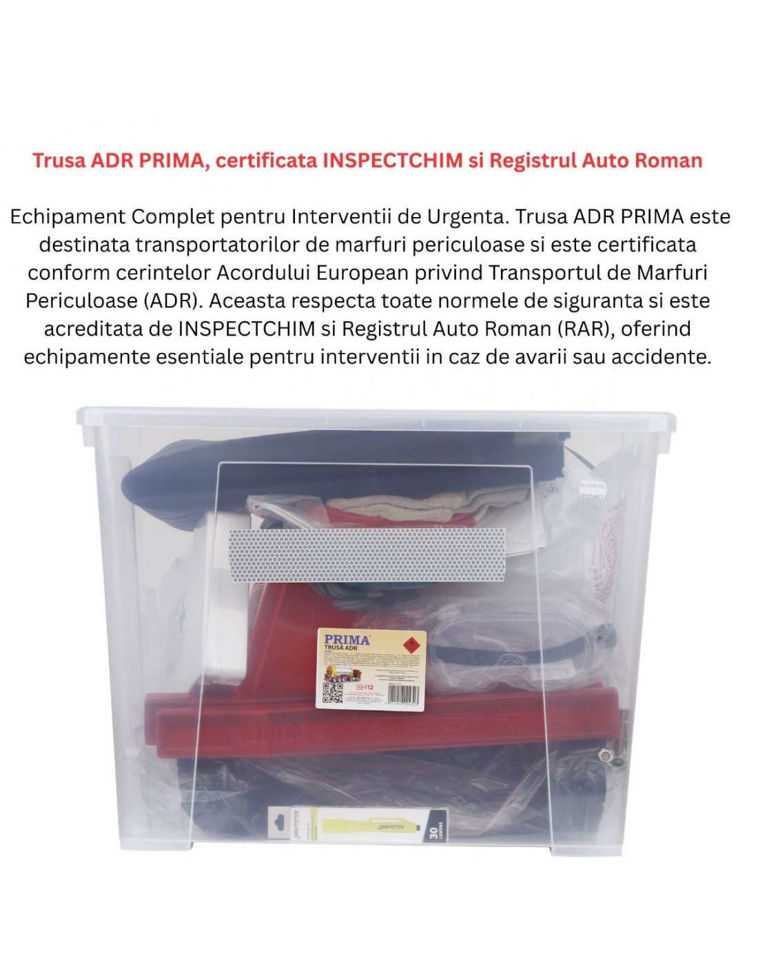 - Trusa ADR PRIMA este destinata transportatorilor de marfuri periculoase si este certificata conform cerintelor Acordului European privind Transportul de Marfuri Periculoase (ADR)